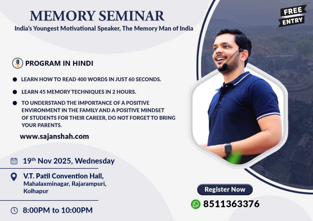A Sensational program to learn more than 20 Memory Techniques and transform your entire study pattern and life. Do come with all your family members and with some reading material. ENTRY ON A FIRST COME FIRST BASIS ONLY.