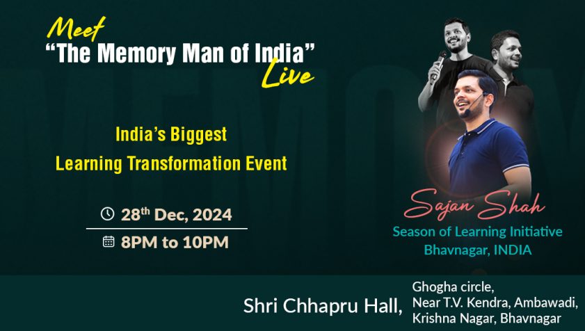 A Sensational program to learn more than 20 Memory Techniques and transform your entire study pattern and life. Do come with all your family members and with some reading material. ENTRY ON A FIRST COME FIRST BASIS ONLY.